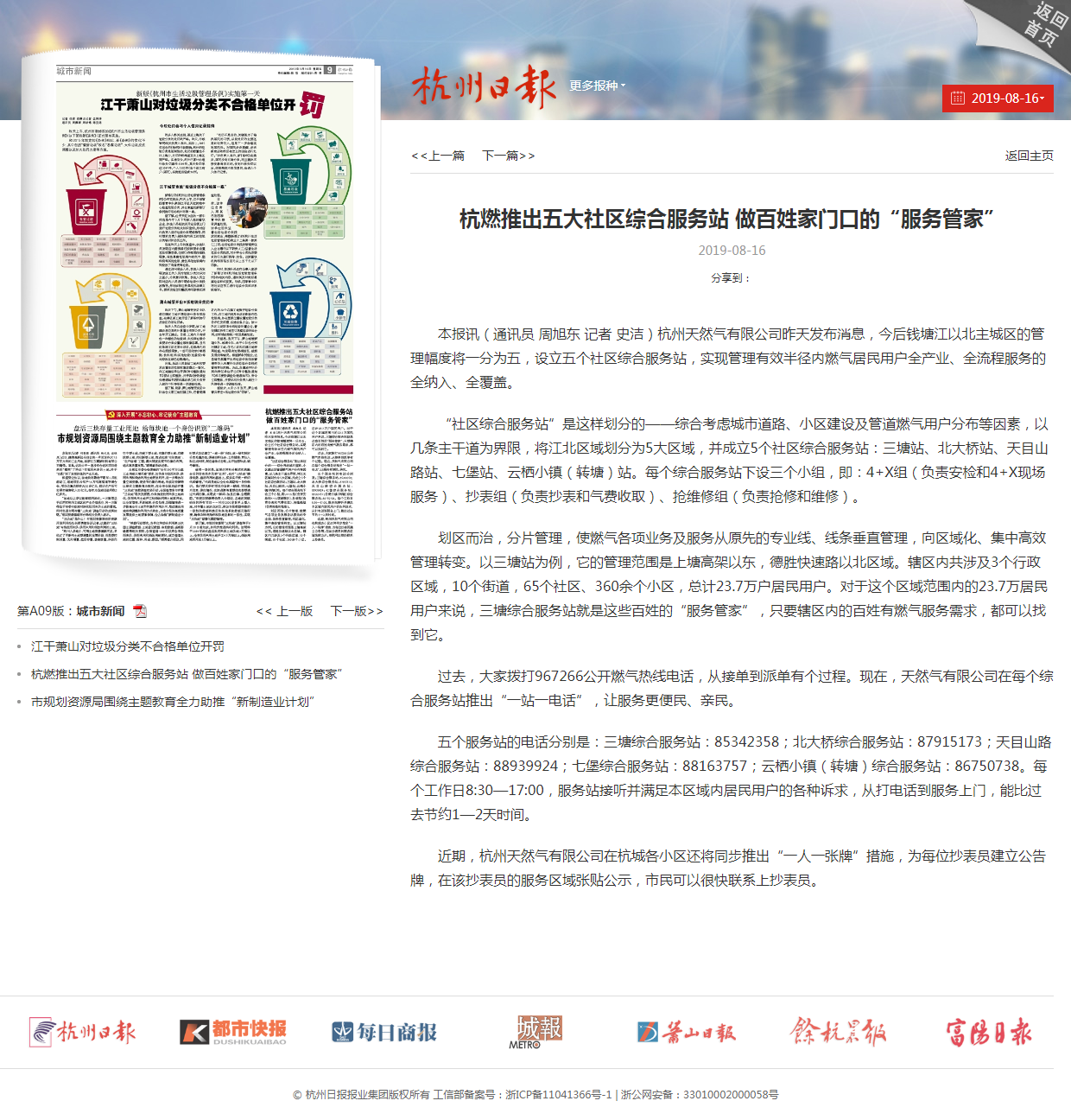 五個服務站的電話分別是:三塘綜合服務站:85342358;北大橋綜合服務站:87915173;天目山路綜合服務站:88939924;七堡綜合服務站:88163757;云棲小鎮(zhèn)(轉塘)綜合服務站:86750738。每個工作日8:30—17:00,服務站接聽并滿足本區(qū)域內(nèi)居民用戶的各種訴求,從打電話到服務上門,能比過去節(jié)約1—2天時間。
